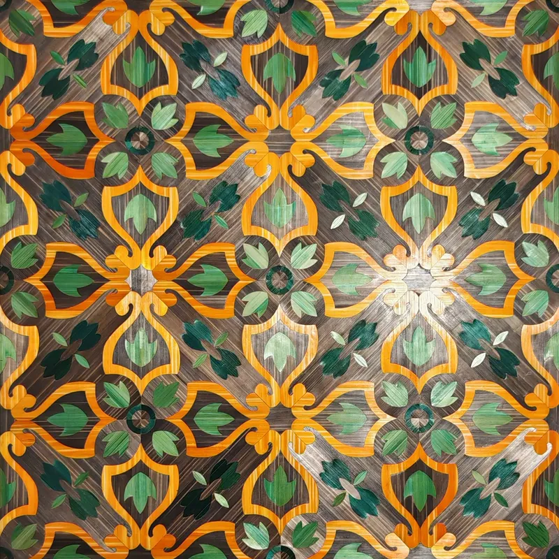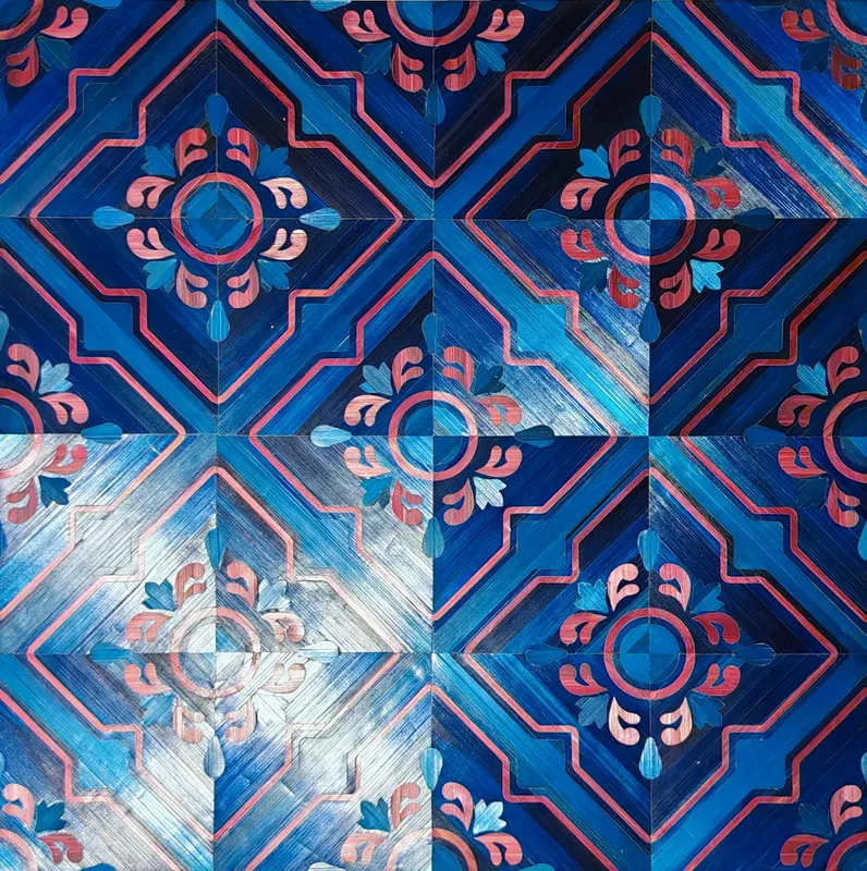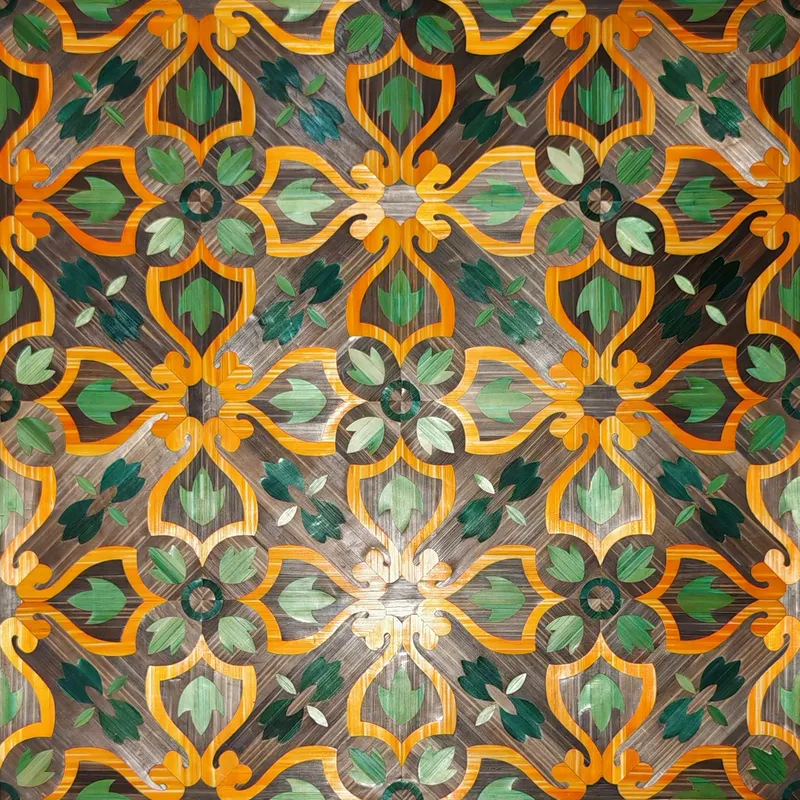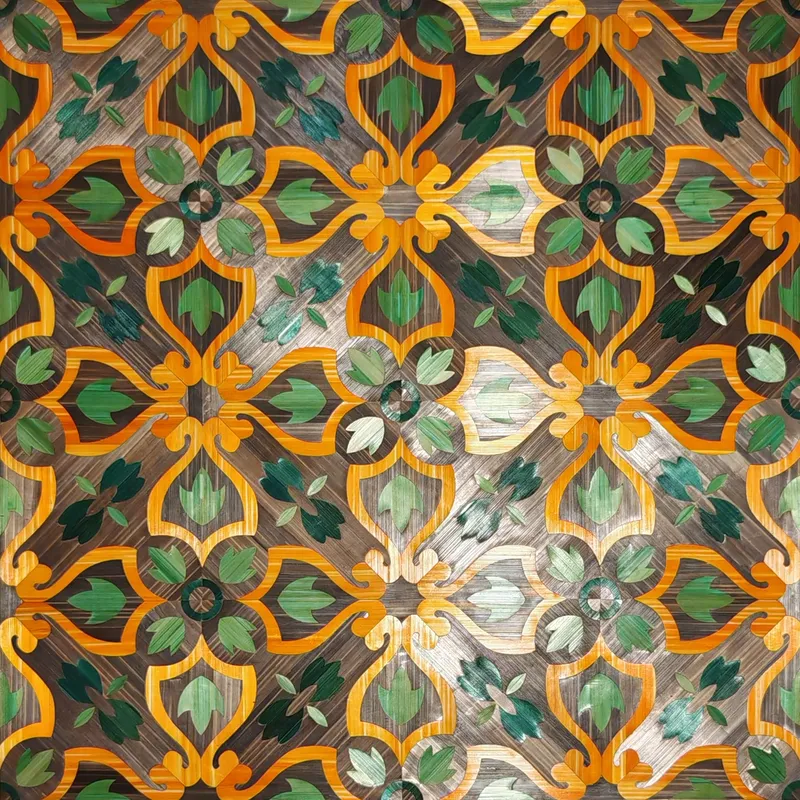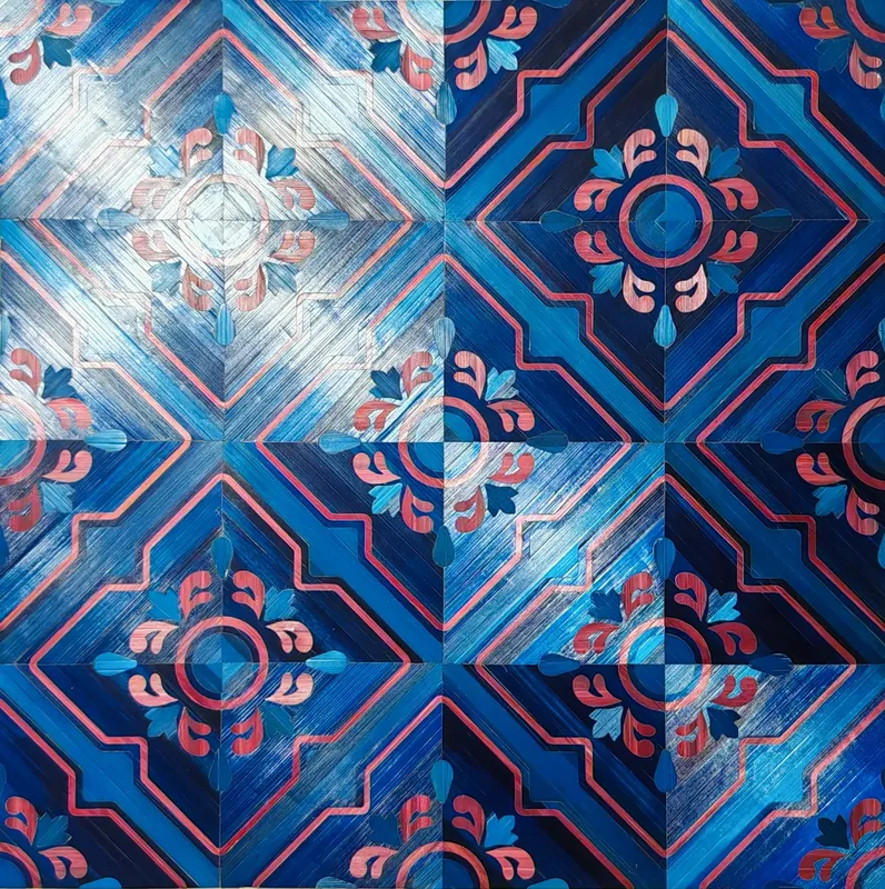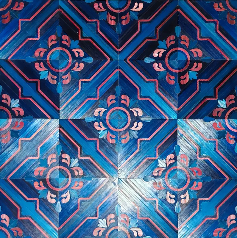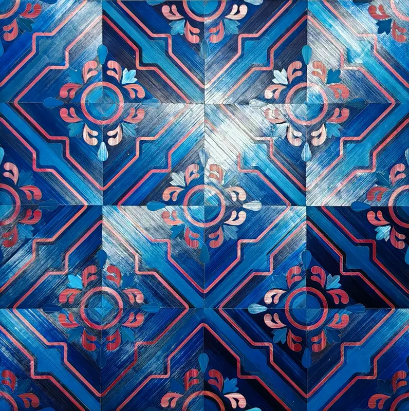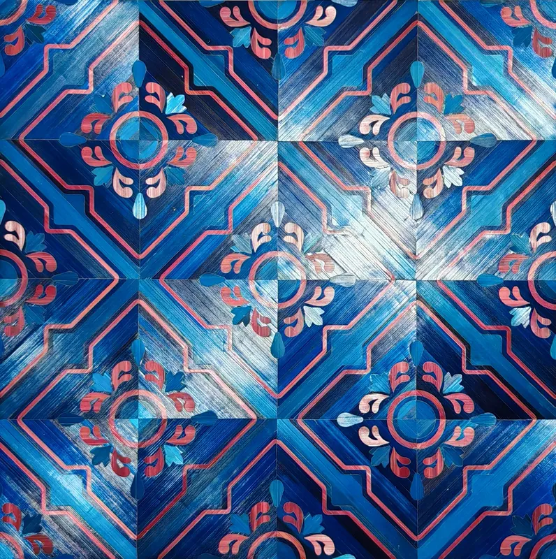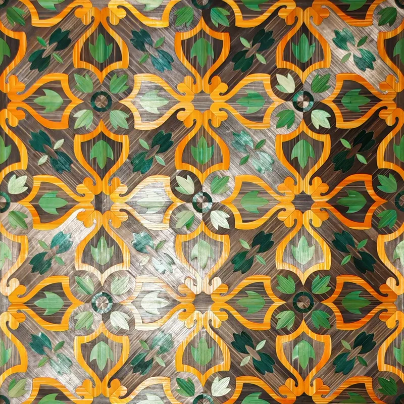 Proposés en tableaux et comme décoration sur mesure, cette série réinvente les carreaux ciment traditionnels en marqueterie de paille.
