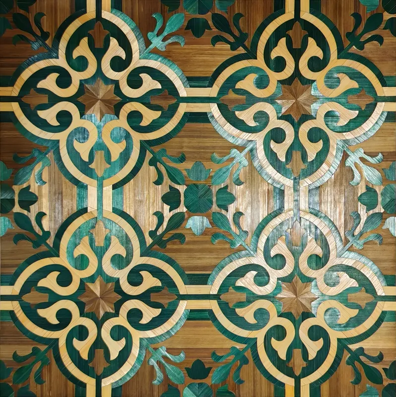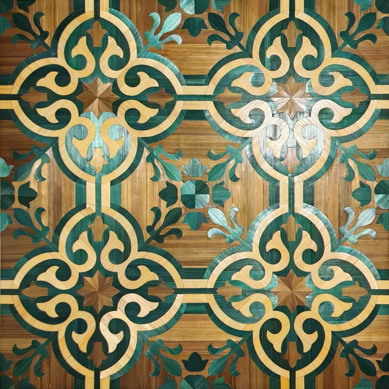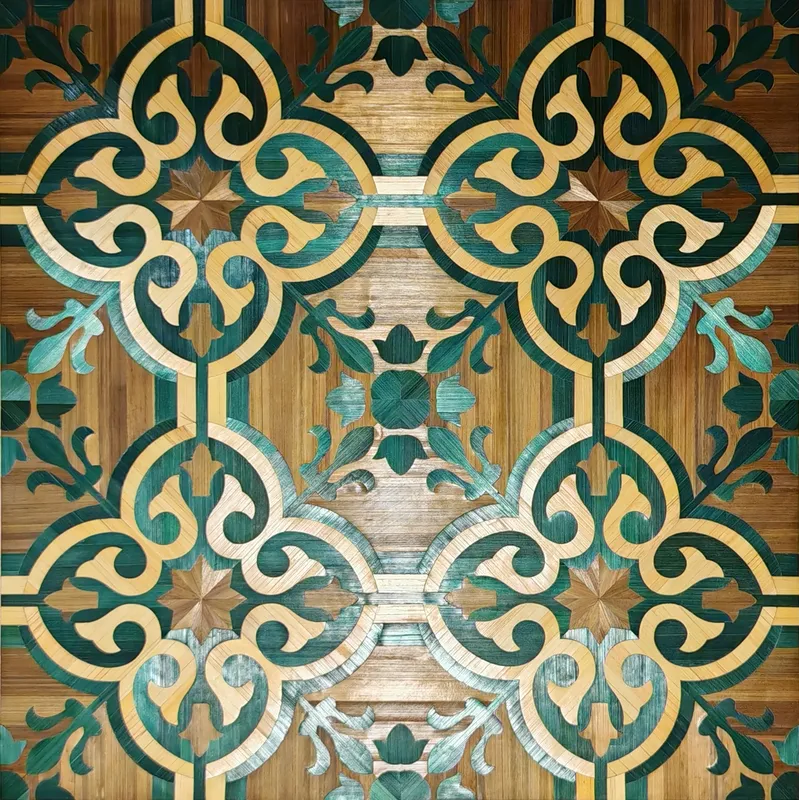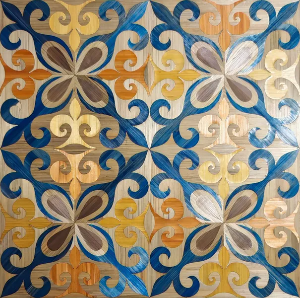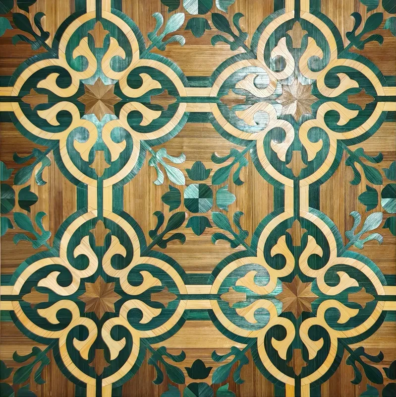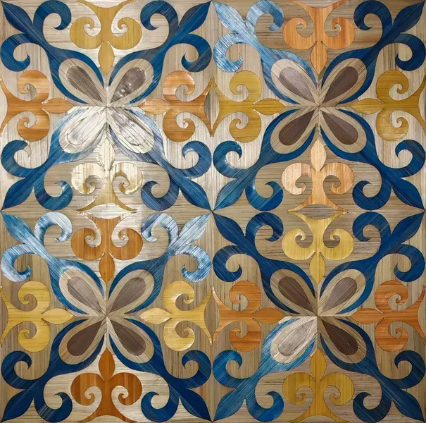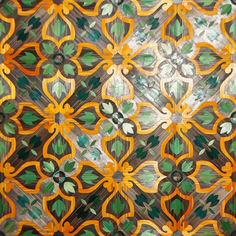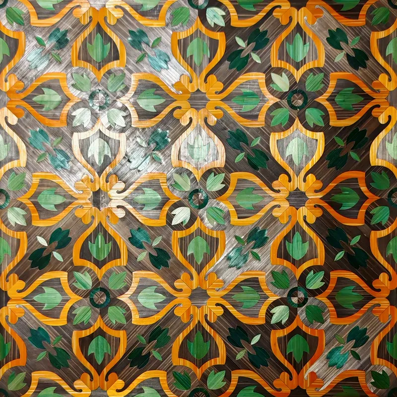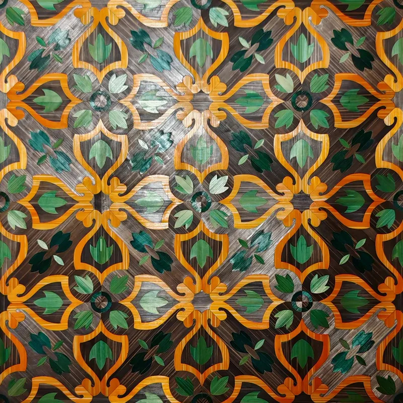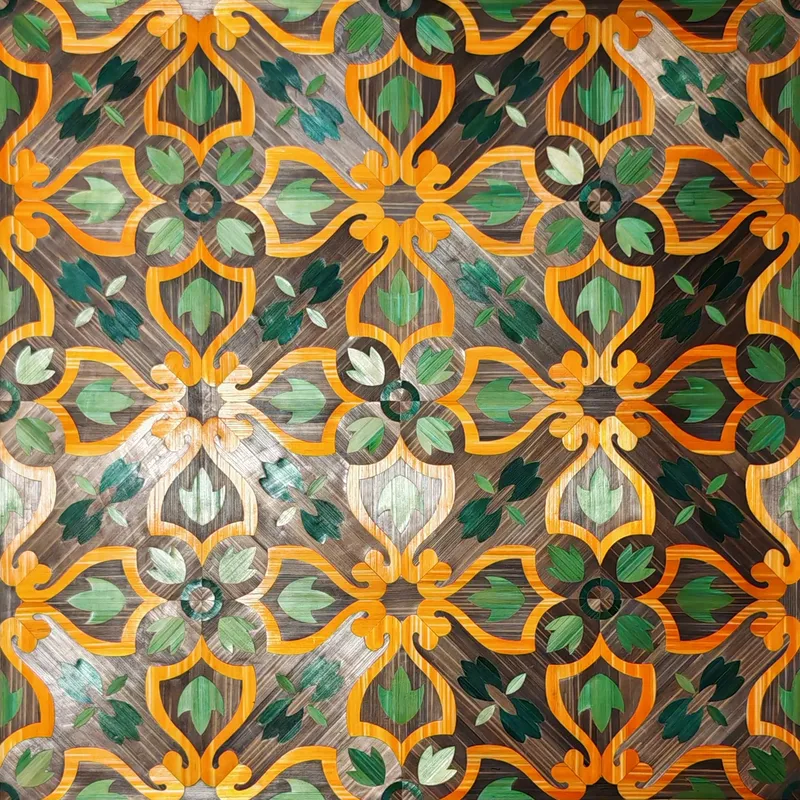 Proposés en tableaux et comme décoration sur mesure, cette série réinvente les carreaux ciment traditionnels en marqueterie de paille.