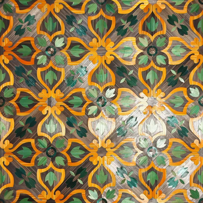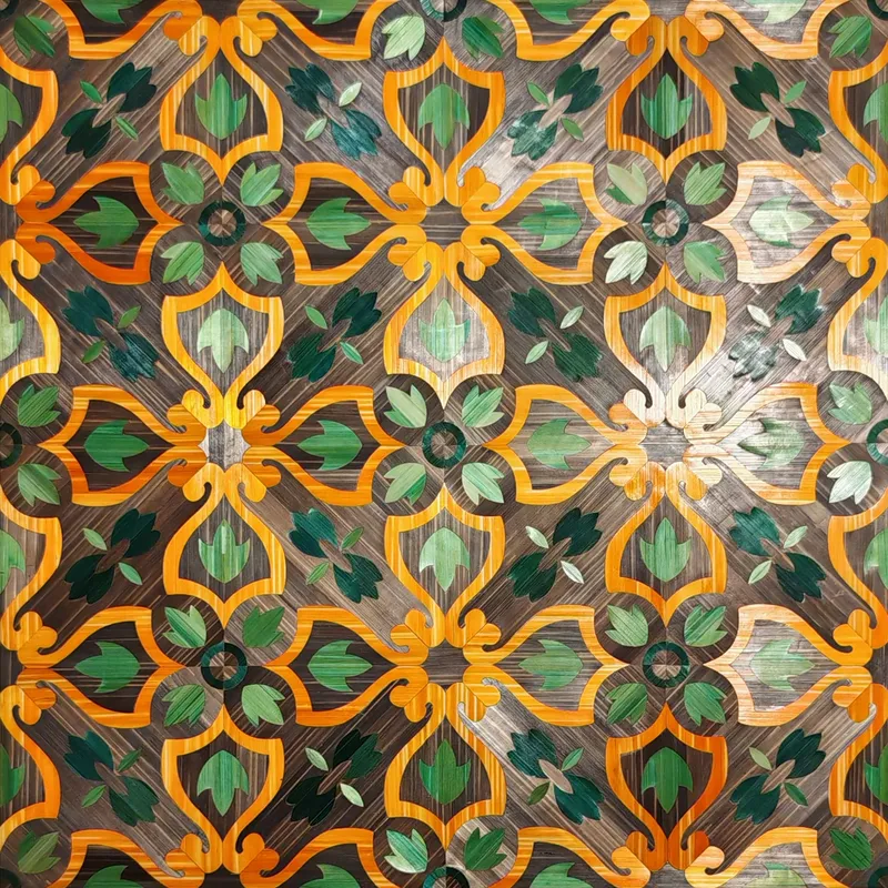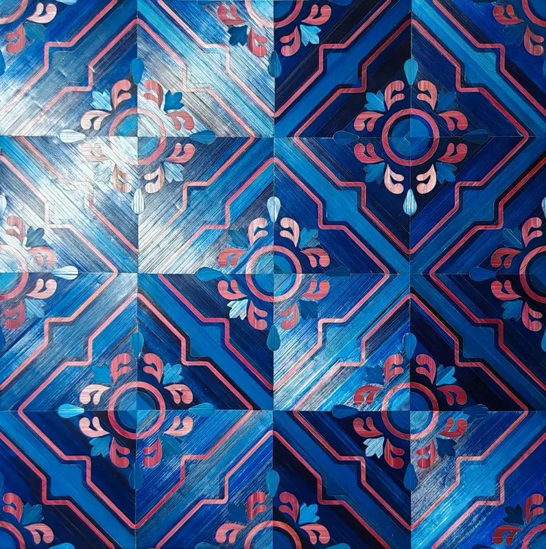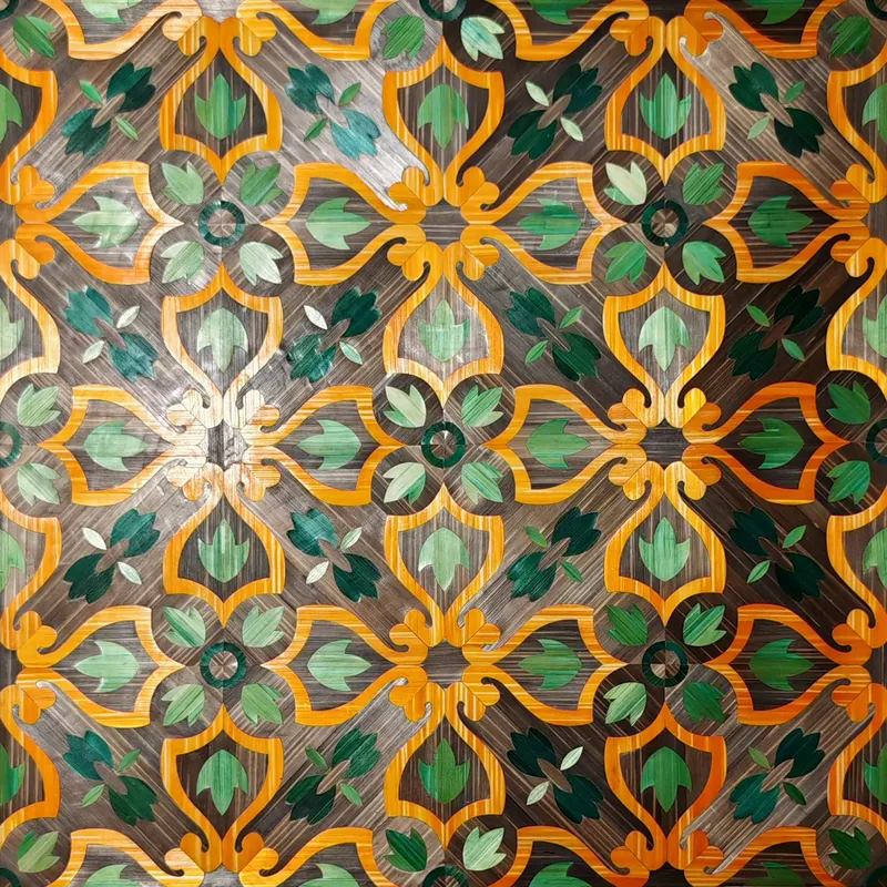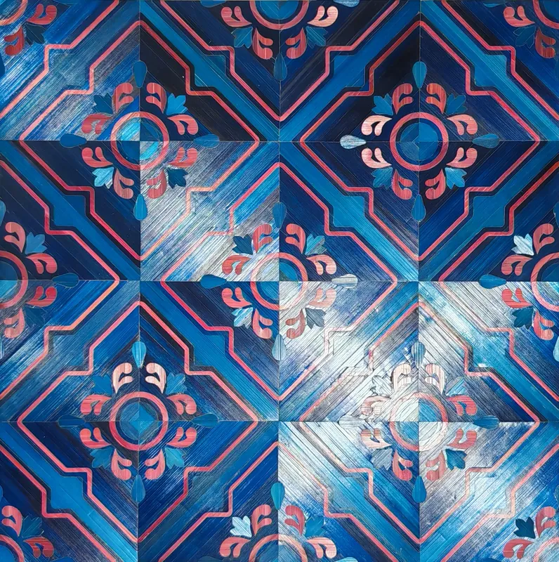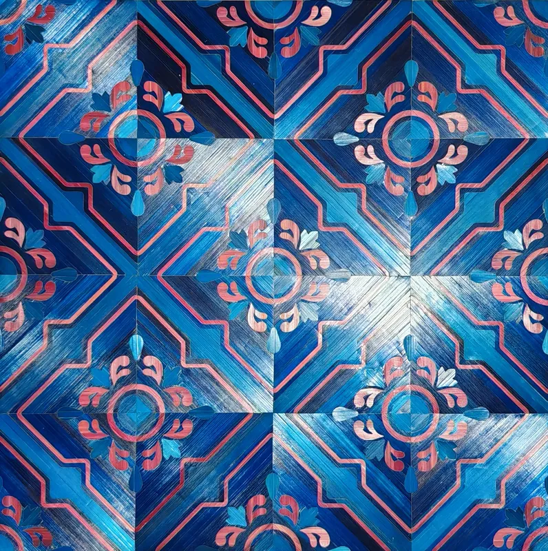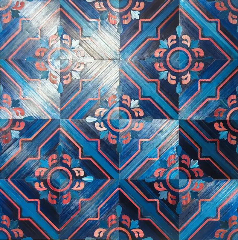Proposés en tableaux et comme décoration sur mesure, cette série réinvente les carreaux ciment traditionnels en marqueterie de paille.